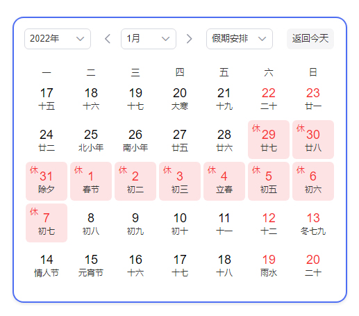 春節(jié)假期從2022年1月29日(農(nóng)歷臘月二十七)至 2022年2月7日(正月初七),共10天。2022年2月8日(農(nóng)歷正月初八)上班。